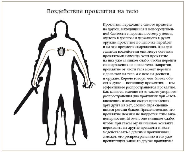 Распространенное на иные предметы действие проклятия, как правило, прекращается, как только затронутый проклятием предмет отделяют от проклятого тела. Однако бывают случаи, когда сам предмет становится проклятым, как, например, Большой меч Арториаса или клинки призраков. Эти кинжалы прокляты, предположительно, в результате длительного воздействия – поэтому ими можно и наносить вред призракам, и блокировать их атаки. Другими словами, проклятия в какой-то степени отменяют друг друга. Призраки, по сути, являются существами материальными, о чем свидетельствует возможность на время преодолеть проклятие, а их бесплотность – это намеренное действие их проклятия. Однако независимо от того, как мы приобрели проклятие и к какому виду оно относится, оно может взаимодействовать с проклятыми телами призраков. Нельзя одним проклятием отменить другое, но чары нового проклятия достаточно сильны, чтобы в перспективе вмешаться в действие старого, и мы пользуемся этим, чтобы уничтожить призраков.