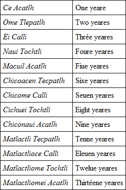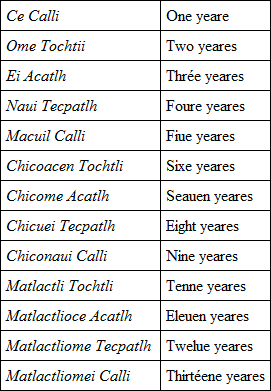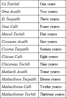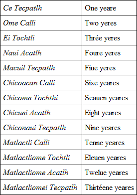 These Mexicans had another order to recken theyr yeares, which exceded not aboue foure in number, as one, two, thrée, foure, wherewith they accounte a hundred, fiue hundred, a thousand, and as many moe as they lust. Those foure figures or names are, Tochtli, Acatlh, Tecpatlh, Calli, and do signifye, a Conny, a Caue, a Knife, and a House, saying.