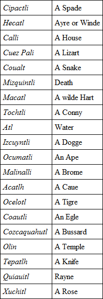 Althoughe these twentie names serue for the whole yere, and are but the dayes of euery moneth, yet therfore euery moneth beginneth not with Cipactli, which is the first name, but as they followe in order, and the fiue odde dayes is the cause thereof. And also bycause theyr wéeke is of thirtéene dayes, which changeth the names, as by example, Cecipactli can go no further thā vnto Matlactlomeiacatl, which is thirtéene, and then beginneth an other wéeke: and we do not say Matlactlinaui Ocelotl, whiche is the fourtéenth day, but we say Ceocelotl whiche is one, and then recken the other sixe names, vnto twenty. And when al the twentie dayes are ended, begin againe to recken from the first name of the twentie, but not frō one, but from viij. And bicause ye may better vndrestand the matter, here is the example.