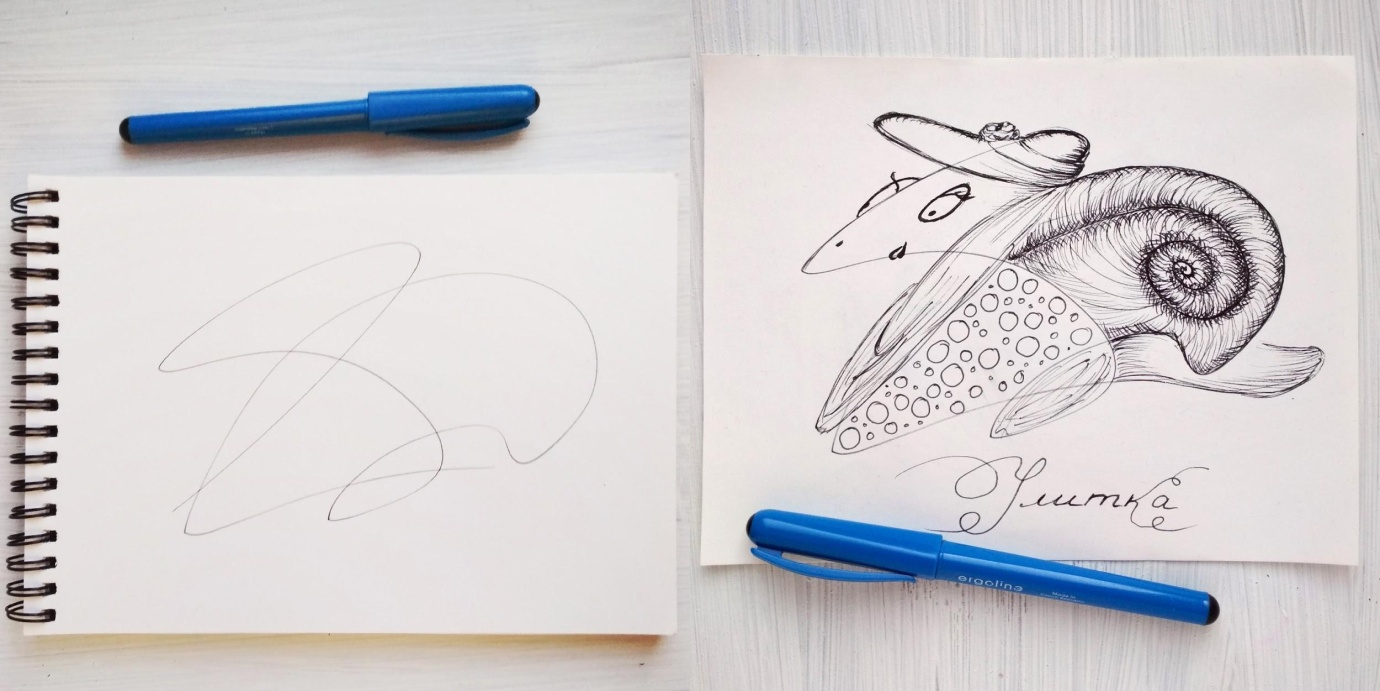 Чтобы преодолеть страх всё запороть и неуверенность, мы начнём с… каракуль. Берите блокнот, линер и… выпускайте вашу плавную извилистую линию на прогулку! Не анализируйте, а просто нарисуйте одну, вторую… сколько поместится замкнутых линий на листе, а может и на двух. Остановитесь и всмотритесь в ваши фигуры. На что они похожи? Покрутите лист. Дорисуйте образ, используя линер и карандаши. Выполните столько раз, сколько вам будет комфортно.