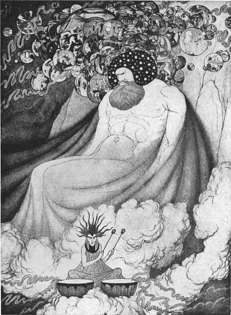 И, увидев, что МАНА-ЙУД-СУШАИ заснул, боги замолчали, и в Пегане воцарилась тишина, слышна была только барабанная дробь Скарла. Скарл сидел в туманной мгле у ног МАНА-ЙУД-СУШАИ, над богами Пеганы, и бил в барабан. Некоторые говорят, что Миры и Солнца – это лишь эхо барабанной дроби Скарла, а другие считают, что это сны МАНА, которые навевает ему барабан Скарла, вроде тех, что иногда могут привидеться, если сквозь сон услышишь мелодию песни, но это лишь предположения, ведь никто никогда не слышал голоса МАНА-ЙУД-СУШАИ и никогда не видел его барабанщика.