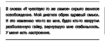 Я всегда остро чувствовала энергию людей, окружающих меня, и мест, где я находилась, всегда замечала тончайший сдвиг в ней, как ощущала малейшее понижение температуры. И теперь мое понимание самой себя в этом мире изменилось буквально в одночасье. Все вокруг наполнилось светом и стало легче. Будто я наконец выучила слова песни, которую на протяжении многих лет пела совершенно неправильно. Все обрело смысл. Понимание того, что настроения других людей были такими же внезапными и неконтролируемыми, как и мои собственные, облегчало бремя моего взаимодействия с ними. Пожалуй, впервые в жизни я поняла, что их настроения могут не иметь ко мне ни малейшего отношения.
