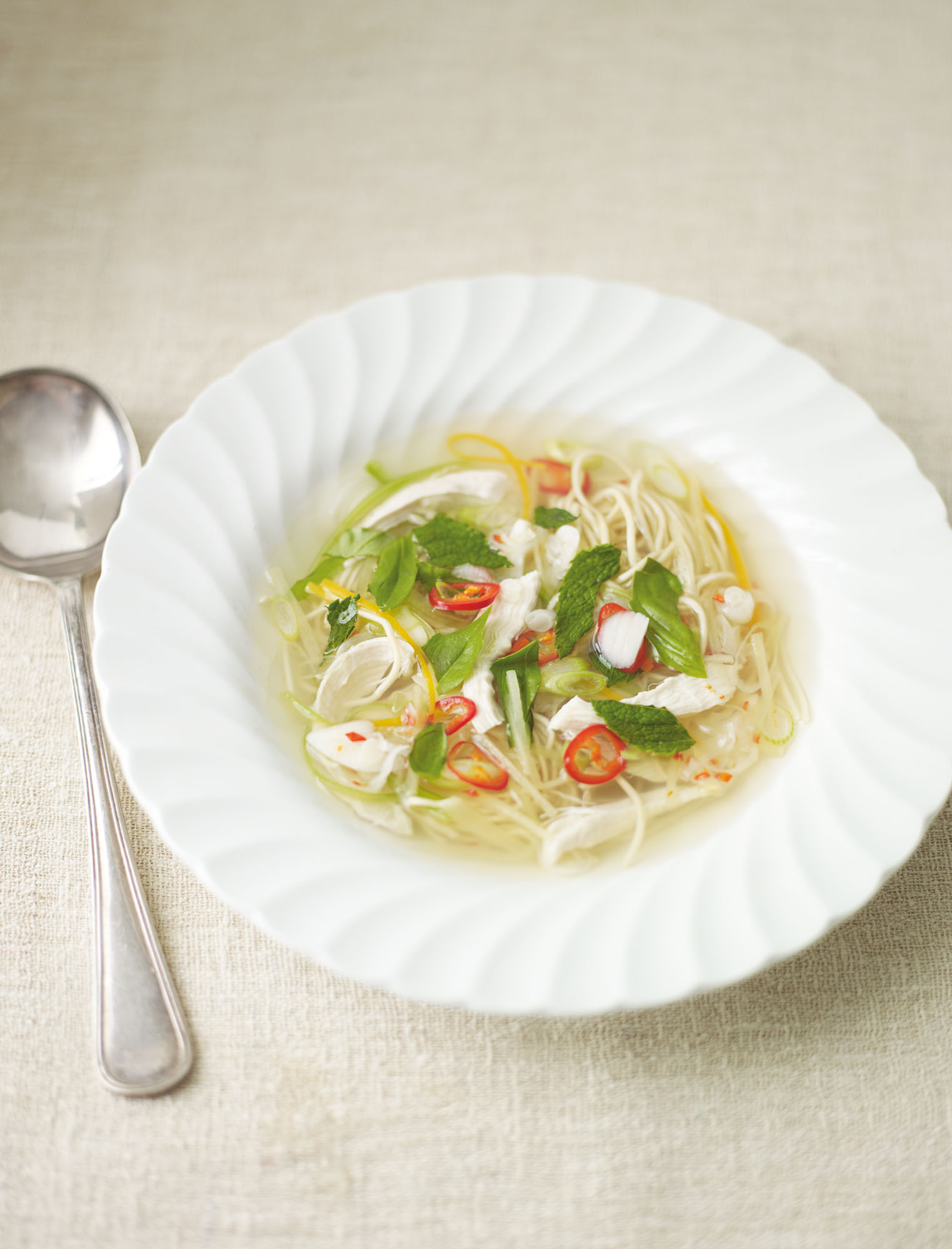 Rip up half of the basil and mint leaves, stir through the soup with the spring onion greens and then divide the soup among 4–6 bowls. Scatter the remaining herbs over the top and squeeze a little lime juice over each one to finish.
