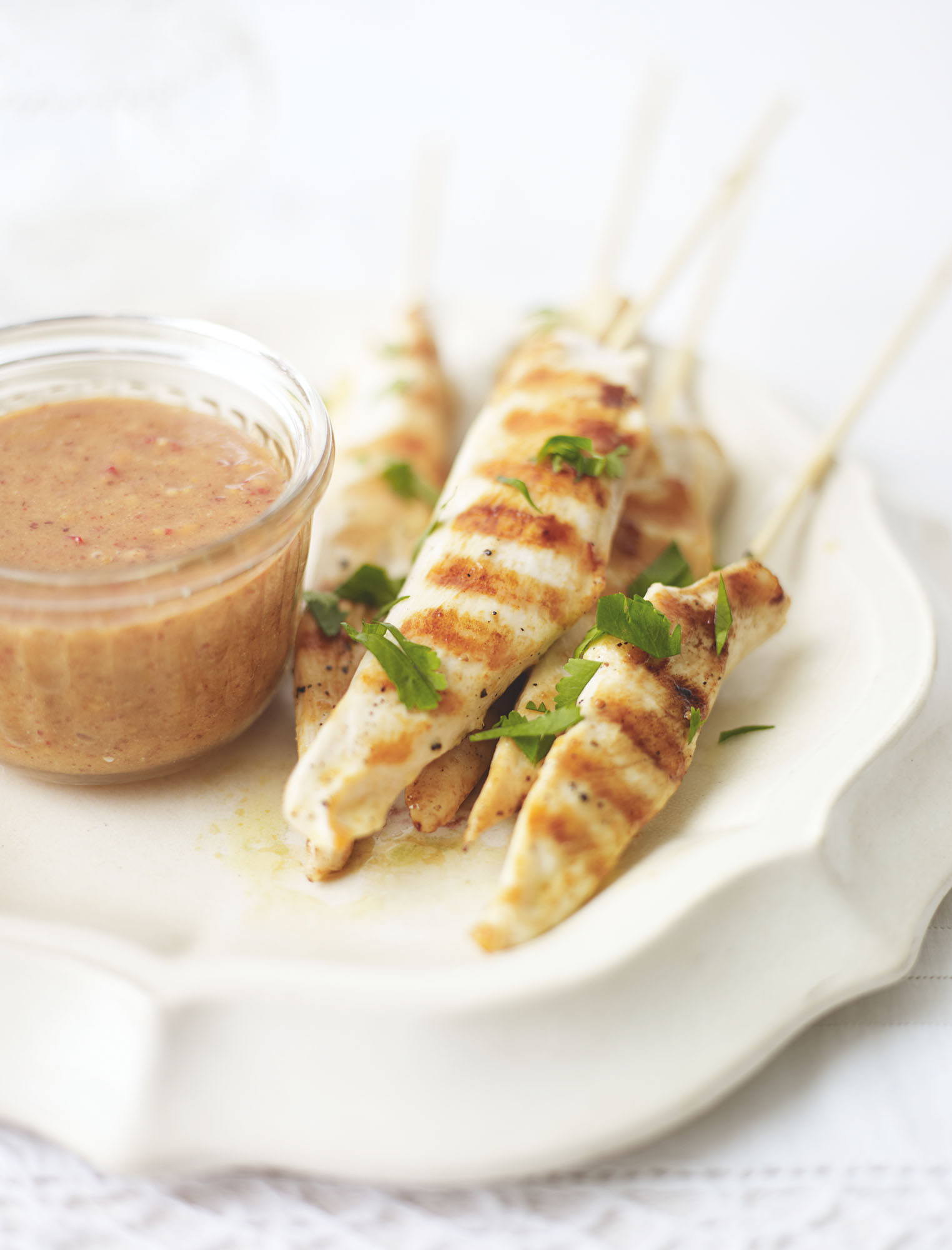 Serve three satay sticks per person sprinkled with some coriander leaves and accompanied by the peanut sauce.