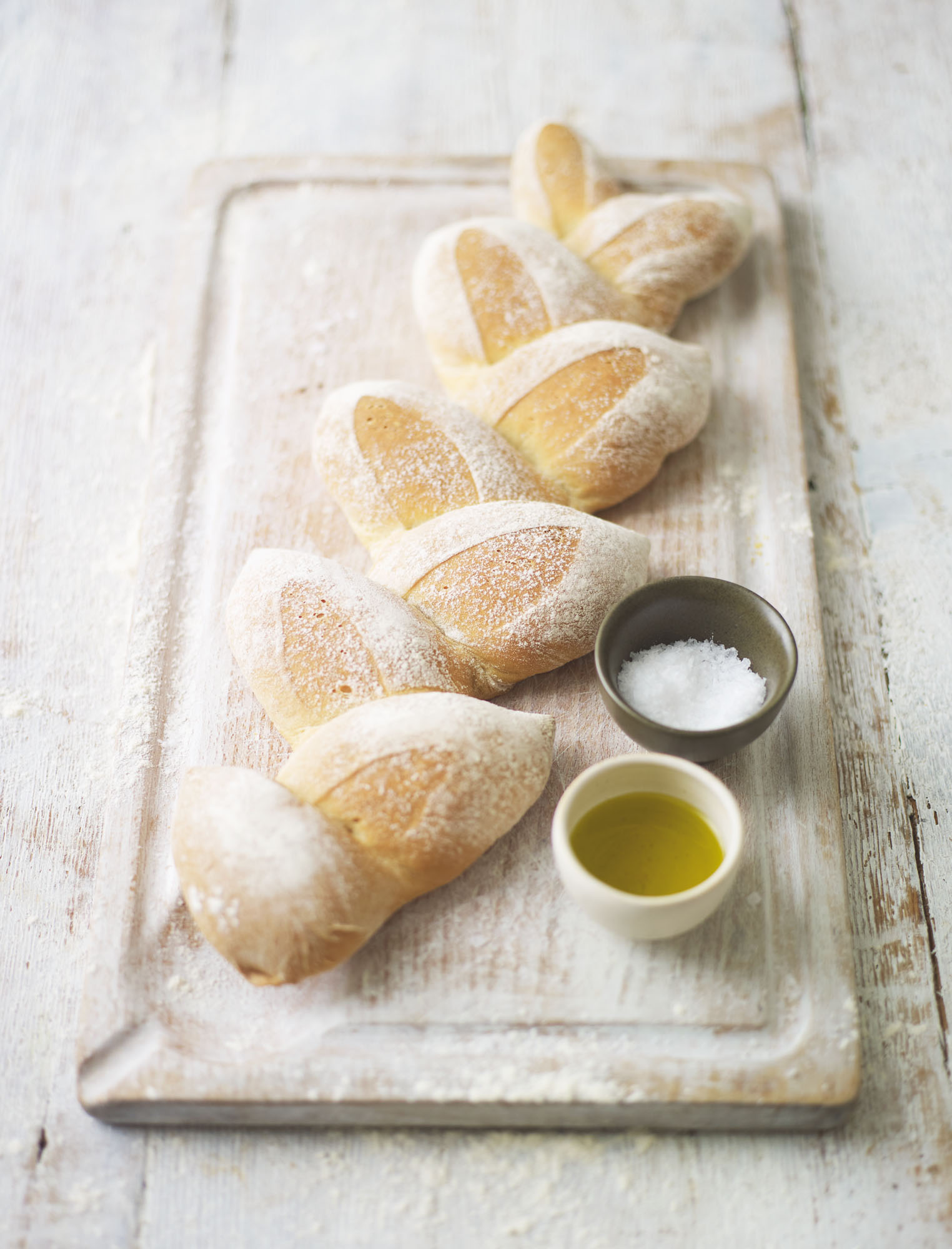 The way of shaping this loaf transforms an ordinary baguette into quite a stunner. Place the loaf at the centre of the table so everyone can break off a big hunk. Although there is olive oil in the recipe, I like to serve a little extra oil with a drizzle of balsamic, but it goes really well with butter too. As with most bread, this is best served warm.