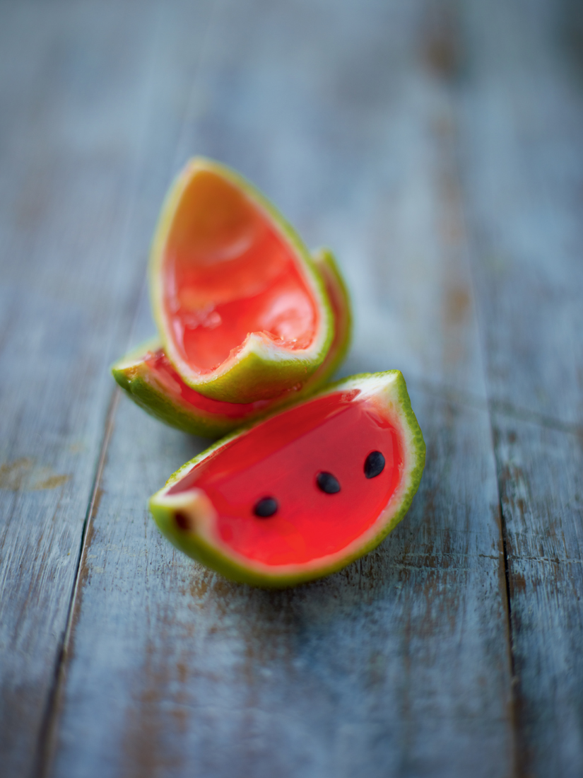 If you were a sporty type at school, you may remember those little orange slices that were given out at half-time during matches. A momentary respite from jumping and leaping in the air on a cold windy netball court in the depths of winter seems to be a vivid memory from my early teenage years. Naturally, giving you a recipe for orange slices may have proven uninspiring so, with a bit of cooking magic, I would like to introduce you to my watermelon jello shots … A happy walk down memory lane with a very modern twist. For an alcoholic version, replace 150ml of the water with some vodka.