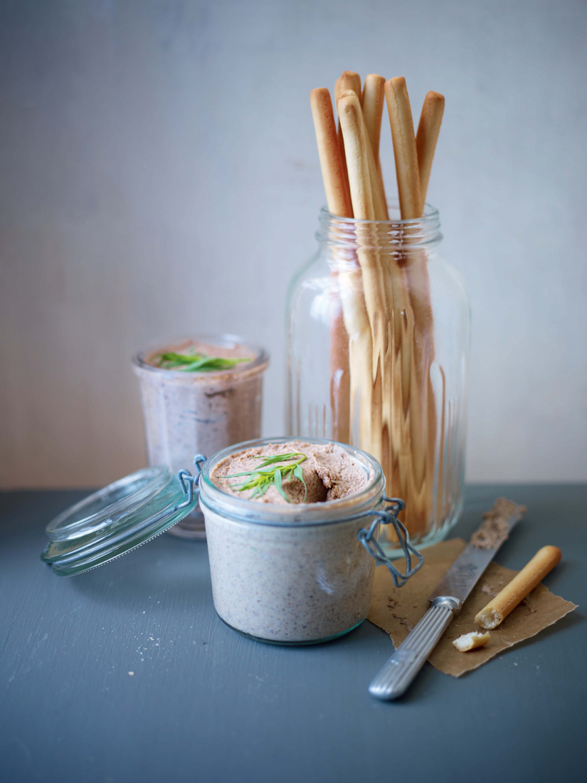 + Divide between the ramekins, smooth their tops and place a tarragon sprig on top of each to decorate. Arrange them on a small tray or plate, cover with cling film and refrigerate for at least 6 hours or overnight. You can also serve these straight away, but their texture will be much softer and flavour not so intense. Serve with your favourite bread, crackers or breadsticks.