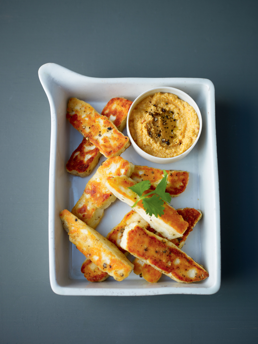 Crunchy black pepper halloumi dip sticks with harissa hummus