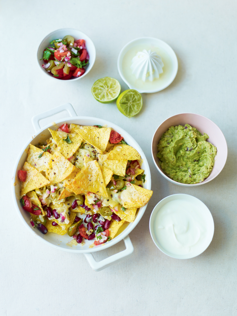 + Spoon the sour cream, remaining tomato salsa and guacamole into small serving bowls. Remove the now-cooked nachos from the oven. The cheese should be bubbling and the tortillas just catching colour. Serve in the centre of the table with the accompaniments for everyone to dig in and help themselves.