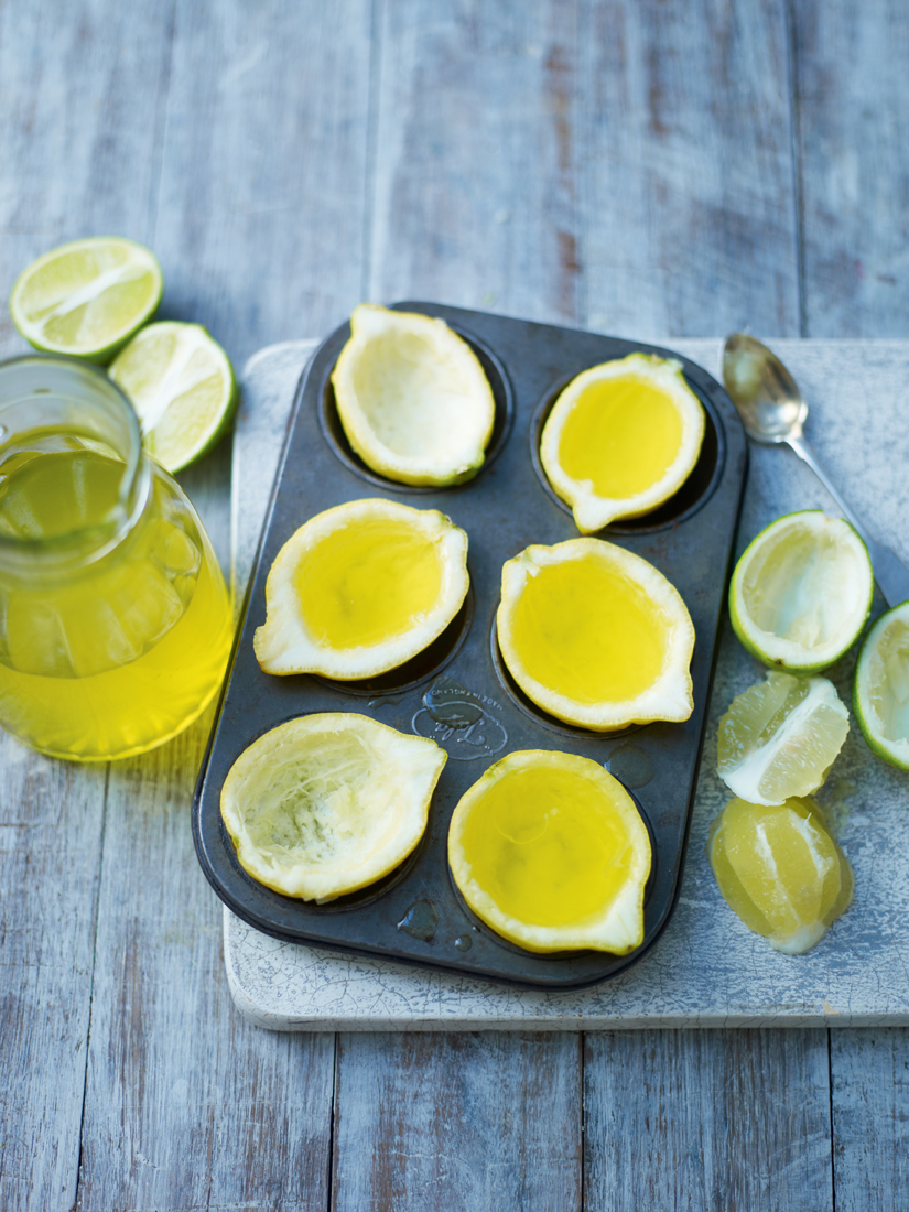 Remove these sassy sunshine slices from the freezer or fridge an hour or so before you want to use them so they soften slightly before eating. Of course, these can be made for the kiddies, but for adults I like to add 150ml of lovely, luscious limoncello to 350ml of water. No need to heat it; just dissolve the jelly in boiling water, add the gelatine leaves, then finish with the limoncello and sugar.