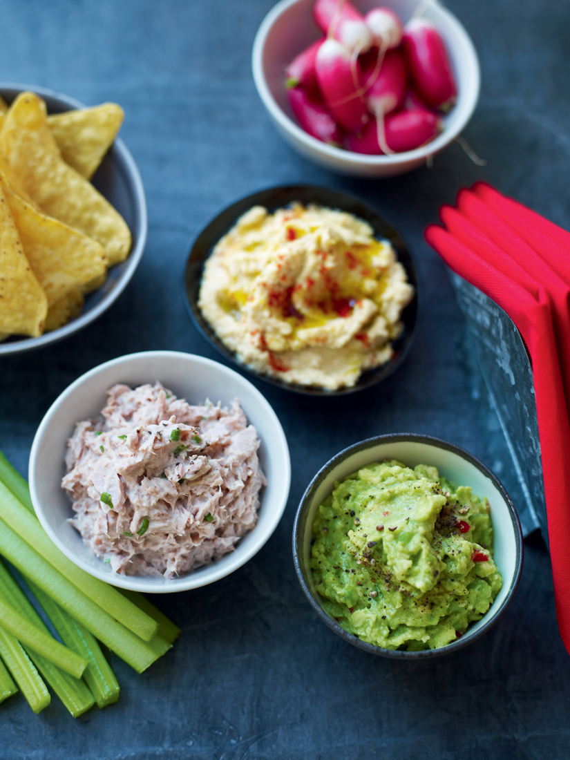 Three tasty, no-cook skinny dip numbers; great to eat with potato-skin crisps, tortilla chips or crudités such as carrots, radishes and celery. You can make them all or just one or two. They can all be made ahead of time for stress-free snacking!