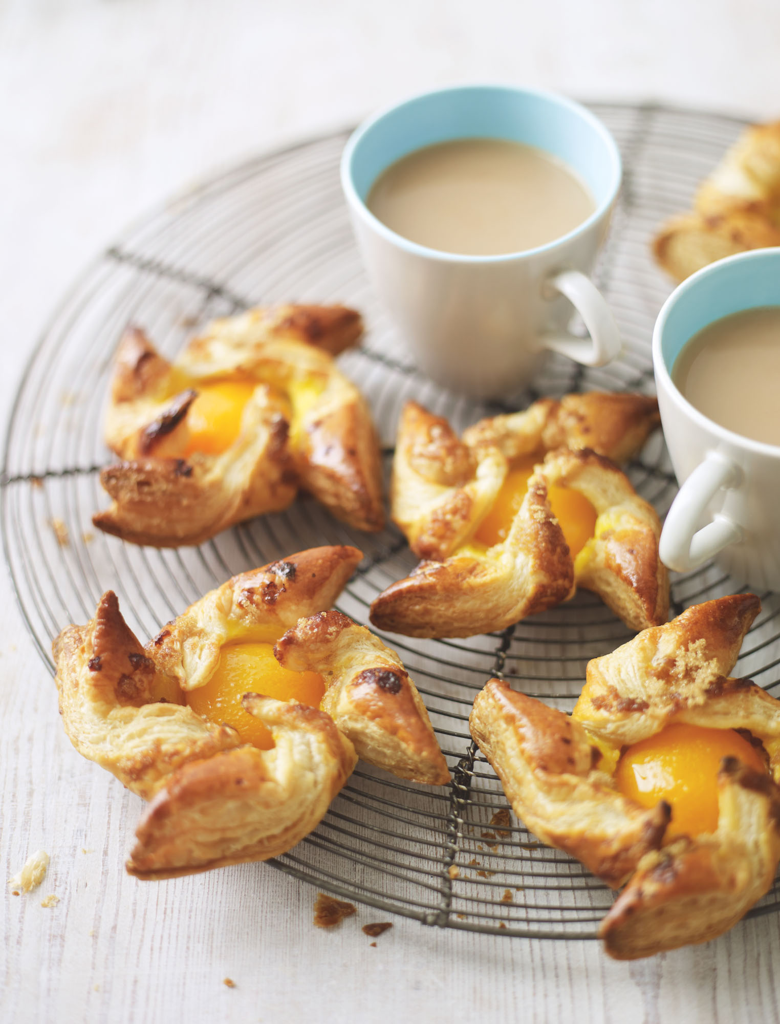 When I am thinking of ideas for recipe testing, I lock myself in the kitchen with the television on and a huge pile of ingredients and just experiment. About 1 o’clock one Sunday morning, I was standing in the kitchen and staring at a block of puff pastry that had to be used up. I rifled through the cupboards and fridge and found a small tin of apricots and a little tub of ready-made custard. Within a very short space of time, I had conjured up these ‘Danish pastries’ – a more than acceptable alternative to the ‘proper’ ones and with the added satisfaction that they are so quick to make.
