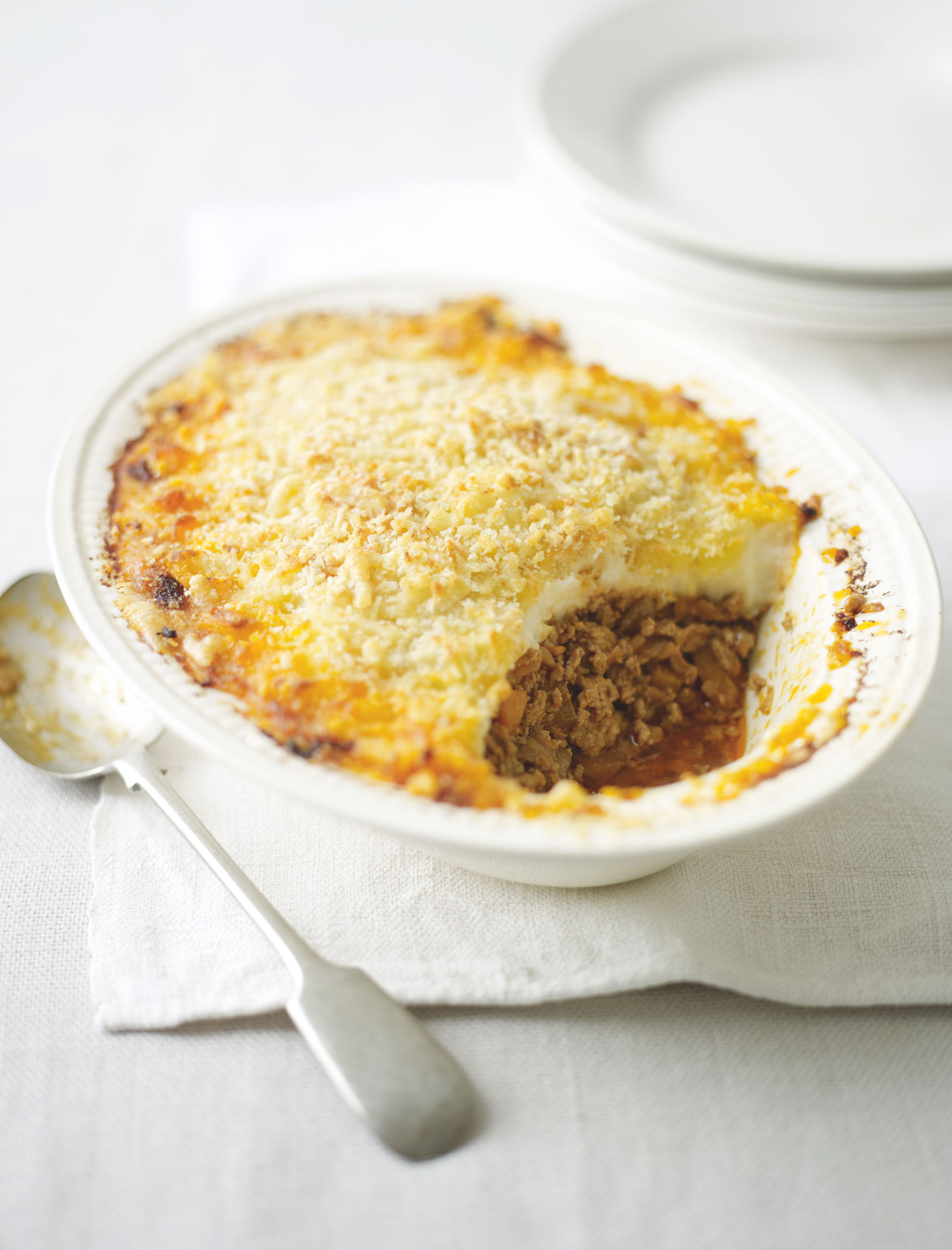Dollop the mash on top and fork it through to make a pattern. I like to allow the mash to cool a bit, then put it into the piping bag fitted with a star nozzle and pipe the mash on top. Cook the shepherd’s pie in the oven for 20–30 minutes. While not strictly authentic, a large handful each of grated cheese and breadcrumbs sprinkled over the top prior to baking is a delicious optional extra.