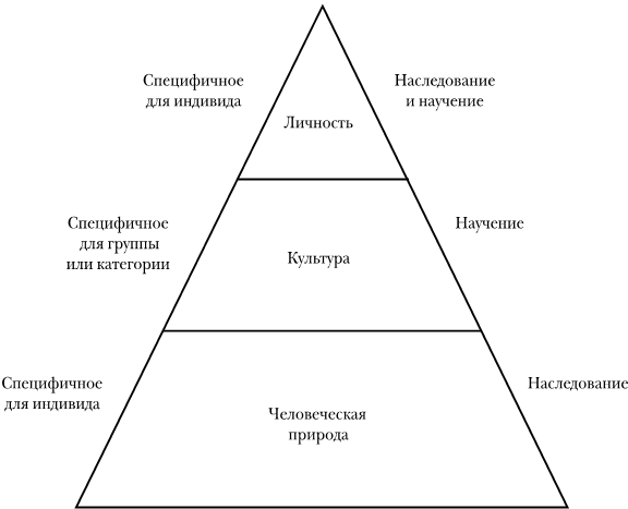 В книге «Последствия культуры», написанной Гертом Хофстеде и его коллегами, я обнаружил полезную схему, которая изображает три фундаментальные силы, мотивирующие человеческое поведение, в виде треугольника, разделенного на три горизонтальных слоя: в основании лежит человеческая природа, ближайший к вершине слой соответствует индивидуальной личности, а между ними лежит культура (рис. 1.1)[27].
