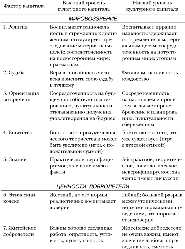 В главе 1 задается концептуальная рамка для всего последующего изложения. Глава посвящена разработке идеи культурного капитала с использованием типологии ценностей – верований – установок. Согласно этой типологии имеется 25 факторов, отношение к которым различно в культурах, тяготеющих к прогрессу и сопротивляющихся ему.