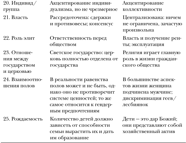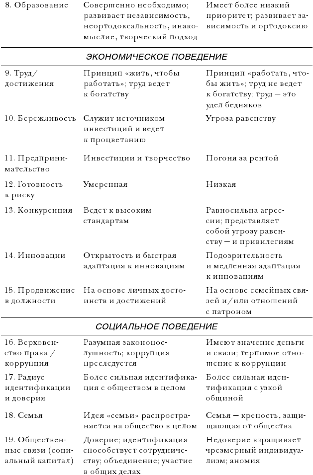 «Ценности могут быть сгруппированы в непротиворечивый паттерн, который мы можем назвать “системой ценностей”. Реальные системы ценностей являются смешанными; чистые системы ценностей существуют только в уме, как идеальные типы. Можно сконструировать две идеальные системы ценностей: одна будет включать только те ценности, которые способствуют экономическому развитию, а другая – только те, которые противятся ему. Страна является современной в той мере, в какой она приближается к первой системе; она остается традиционной в той мере, в какой приближается ко второй. Ни та, ни другая система ценностей не существует в реальности, и ни одна страна не укладывается полностью в какую-либо одну из этих двух систем. Однако некоторые страны близко подходят к крайней точке, максимально благоприятствующей экономическому развитию, в то время как другие близко подходят к противоположной крайней точке.