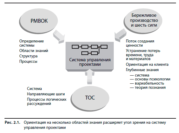 На рис. 2.1 видно, как по-разному подходят к описанию системы управления проектами представители разных теорий. Так, в случае с РМВОК характеристики реальных проектов сравниваются с идеальной моделью, изложенной в этом стандарте и, следовательно, являющейся, с точки зрения РМВОК, правильной. При таком подходе вряд ли причиной неудач может быть признан какой-либо из элементов самой модели. Скорее, неудачи в проекте будут связываться с неверным применением подхода, описанного в РМВОК в качестве модели. То же самое справедливо практически для любой ныне издающейся литературы по управлению проектами. Как отметил доктор Деминг, нельзя ожидать каких-либо значительных перемен в замкнутой системе, новые знания всегда приходят извне. При столкновении с системными проблемами изолированная концепция РМВОК будет лишь предлагать усилить контроль за правильным применением идеализированной модели.