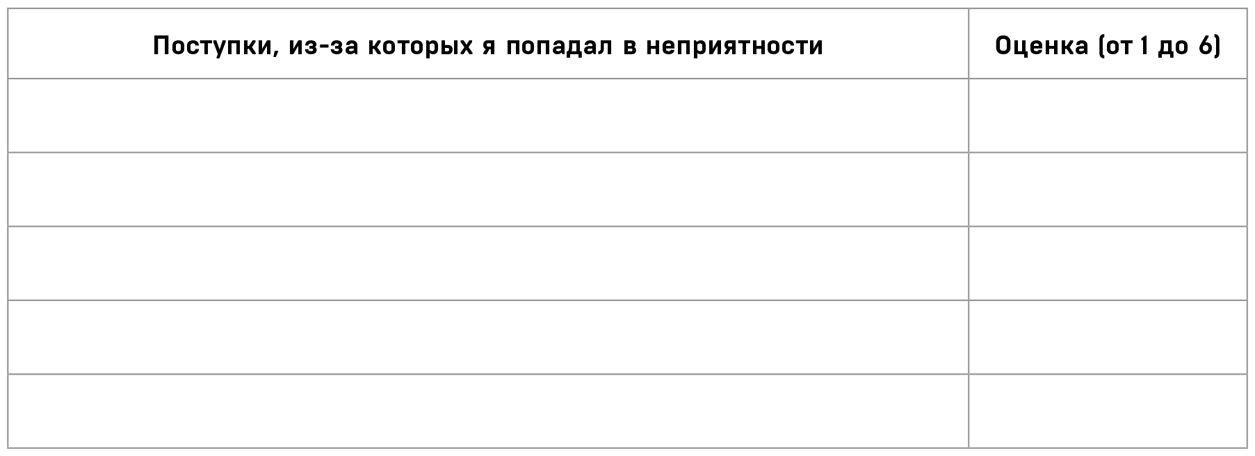 В таблице запиши пять поступков, из-за которых ты попадал в неприятные ситуации. Затем оцени каждый из них с помощью шкалы.