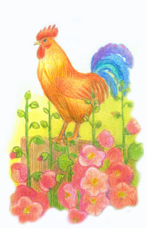 Выглянув во двор, она увидела возле цветника на заборе молоденького рыжего петушка.