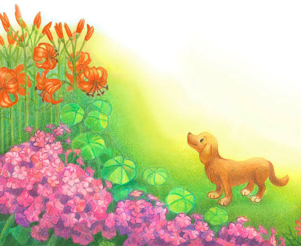 Пёсик остановился возле цветочной клумбы, что росла под окном дома, и начал оглядываться вокруг, ища девочку.
