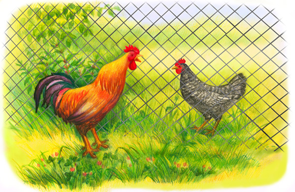 На радостях он уже вознамерился обнять курочку, но тут же клювом наткнулся на прочную сетку.