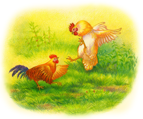 – Ай! Ай! – закудахтал белый петух.– Как ты смеешь выступать против своего хозяина! Предательница! Сейчас я тебя проучу!