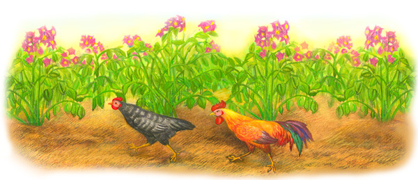Однако петушок будто не слышал. Он изо всех сил мчался за курочкой, и вскоре они оба скрылись в высокой ботве картофельного поля.