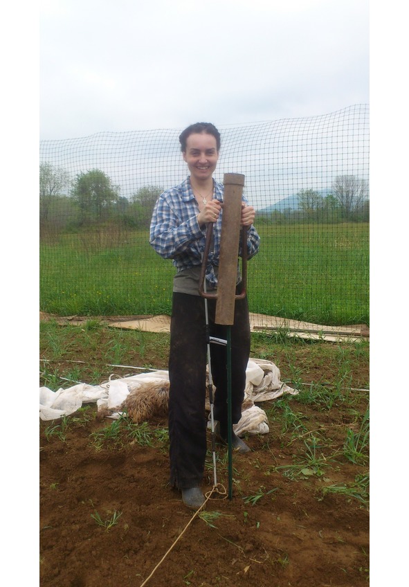 Наконец, один за другим начали забивать их в землю нехитрым, но крайне эффективным устройством – post pounder, которого я, тем не менее, никогда в наших деревнях не видела (впрочем, наверное, потому, что сама нечасто там бываю и уж точно не работаю на земле). Это штуковина представляет собой что-то типа ручной металлической сваи – тяжеленного полого внутри цилиндра с ручками по обеим сторонам и мощной заклепкой сверху. Цилиндр надевается на столб, а ты, приподнимая его, а затем сильно дёргая за ручки цилиндра, начинаешь забивать столб в землю.