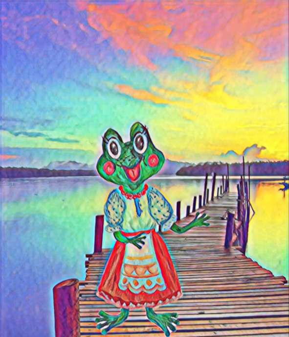 По тропинке, вдоль речушки,Увидав чудесный дом,Одинокая ЛягушкаСкачет быстро ясным днём.– Ква, ква, ква, -кричит в окошко.– В домике хозяйка есть?– Отдохнуть бы мне немножко.– На террасе вот присесть.– Чаю тоже бы хотелось– Мне с кусочком пирога.– Выходи скорей хозяйка!– Познакомимся пока.Только тихо в доме нашем.Видно, в доме никого…И Лягушка заглянулаВ разноцветное окно.Занавеску отодвинув,Увидала шкаф, комод.У стола стоят в рядочекСтульев целый хоровод.Есть и мягкая кроваткаИ диванчик у стены.На окне горшки с цветами.На полу половички.– Что ж, – сама себе сказала,– Поживу я в Теремке.И на кухню поскакала,Варить кашу в чугунке.