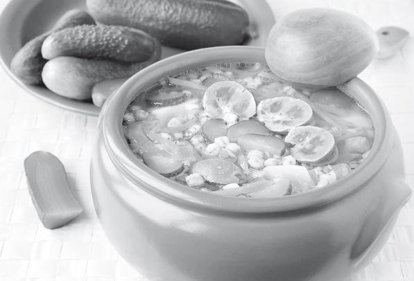 Порезать соломкой репчатый лук, лук-порей, морковь и корень петрушки, а потом – солёные огурцы. Овощи пассеровать на масле до чуть золотистого цвета, после чего добавить нарезанные огурцы, влить рассол и ещё чуть-чуть потушить. В процеженный бульон добавить перловую крупу и варить 15 минут. Добавить порезанный брусками картофель и варить ещё 5–7 минут.