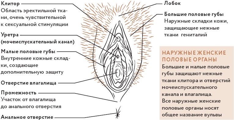 Рассматривая вульву, нельзя не заметить анальное отверстие (анус) – коричневую морщинистую область. Анус не относится к половым органам, но находится очень близко к ним. От вагины его отделяет лишь тонкая внутренняя перегородка. Поэтому многие заболевания вульвы сказываются и на анусе, а проблемы с прямой кишкой могут влиять на половые органы.