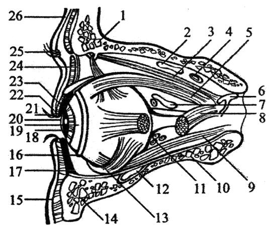 1 — лобная кость; 2 — лицевой нерв; 3 — верхняя косая мышца; 4 – блоковый нерв; 5 — верхняя прямая мышца; 6 – общий глазодвигательный нерв; 7 – глазничная артерия; 8 — наружная прямая мышца; 9 – нижняя прямая мышца; 10 — клиновидная кость; 11 — задняя артерия; 12 — подглазничный нерв; 13 — нижняя косая мышца; 14 — верхняя челюсть; 15 — круговая мышца глаза; 16 — нижний свод конъюнктивы; 17 — нижний хрящ века; 18 — радужка; 19 – зрачок; 20 — роговица; 21 — ресница; 22 — круговая мышца глаза; 23 — верхний свод конъюнктивы; 24 — глазничная перегородка; 25 — бровь; 26 — кожа