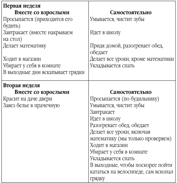 САМОКОНТРОЛЬЕсли вы хотите проверить эффективность своего взаимодействия с ребенком, попробуйте на протяжении месяца вести дневник, каждая страничка которого будет включать две колонки. В одну записывайте то, что он делает вместе со взрослыми, а в другой то, что он делает сам (табл. 2). Постепенно вторая колонка должна пополняться, но и в первой должны появляться все новые и новые записи. Таким образом будет увеличиваться потенциал ребенка на ближайшее будущее. Можно ограничить наблюдение каким-то одним направлением вашего взаимодействия. Например, понаблюдать, как ребенок с вашей помощью делается более самостоятельным в работе на даче или в помощи вам по дому.