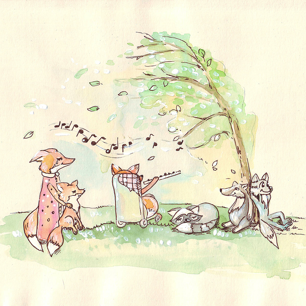 Поднялся сильный ветер, и мама именинника переживала, что праздник не состоится из-за погоды, но волк наоборот был рад сильным порывам ветра. Он смастерил флейту, которая могла играть только при условии сильного ветра, нужно было лишь нажимать на большие клапаны, чтобы получалась мелодия. Лис был счастлив получить такой подарок. Его кресло вынесли на поляну, где ветер срывал летнюю листву. Он взял флейту, сначала немного неуклюже, и чуть не выронил ее на землю. Немного успокоившись, он позволил ветру проникнуть в каждую дырочку и начал нажимать на клапаны. Вся деревня наполнилась волшебной мелодией, незнакомой и невероятно красивой. Эта мелодия лилась прямо из сердца маленького Лиса, который поверил в этот день в то, что мечты обязательно сбываются.