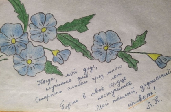 13 лет подружке было,Всё населенье в страхе жило:Шла ненавистная война —И ей не видно было и конца.В альбоме о войне ни слова,И интереса к ней как будто никакого,Одни лишь в девичьей любви признаньяИ долгой жизни пожеланья.Цитаты из альбома (без поправок):«Писать невольно я решила:Любовь заставила меняЯ пишу, а сердце бьетсяАх, как я люблю тебя!Когда в морях воды не будетНа камнях вырастет траваКогда луна светить не будетТогда забуду я тебя»Валя Т. 14 лет 17.12.1944г.«Живи, лови минуты счастья,Они порою хороши!Но не узнавши человекаНе открывай ему души!»Нина И. 13.12.1944г.«Если хочешь мой другБез заботы прожитьПостарайся мой другНикого не любить»Писала яузнай меня.«Желаю хорошо учитьсяИз класса в класс переходитьДомой с надеждой возвращатьсяИ долго весело прожить»Галя С. 03.12.1944г.«Не забывай, что есть на светеИзмена, ложь и клевета,Не попадайся в эти сетиИ будь такой, какой была»Инна П. 13.12.1944г.«Пользуйся жизнью, пока еще можноВерить, страдать и любитьВремя промчится, тогда будет поздноСмерть все заставит забыть»Люся Н. 10.12.1944г. и т. д.