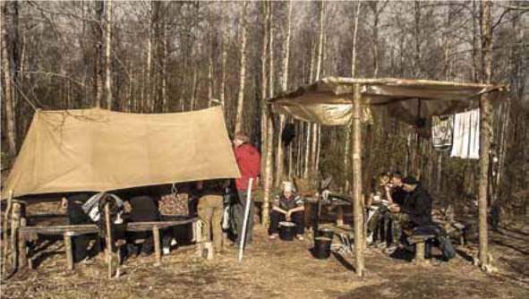 Неподалеку от нашего лагеря была деревня, там мы закупали продукты и ходили в баню. Отряд состоял из 15 человек. Первый день мы обустраивали лагерь, ставили палатки, готовили настил, делали костер, стол.