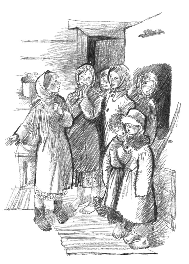 И не успела мать ответить, как орава уже хлынула в горницу. А чтоб не топтать полы, почти все сбросили у дверей валенки и зашлёпали босыми пятками по белым половицам.