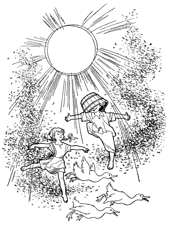 Феня легла спать. А Лёня и Аринка пошли охранять уток.