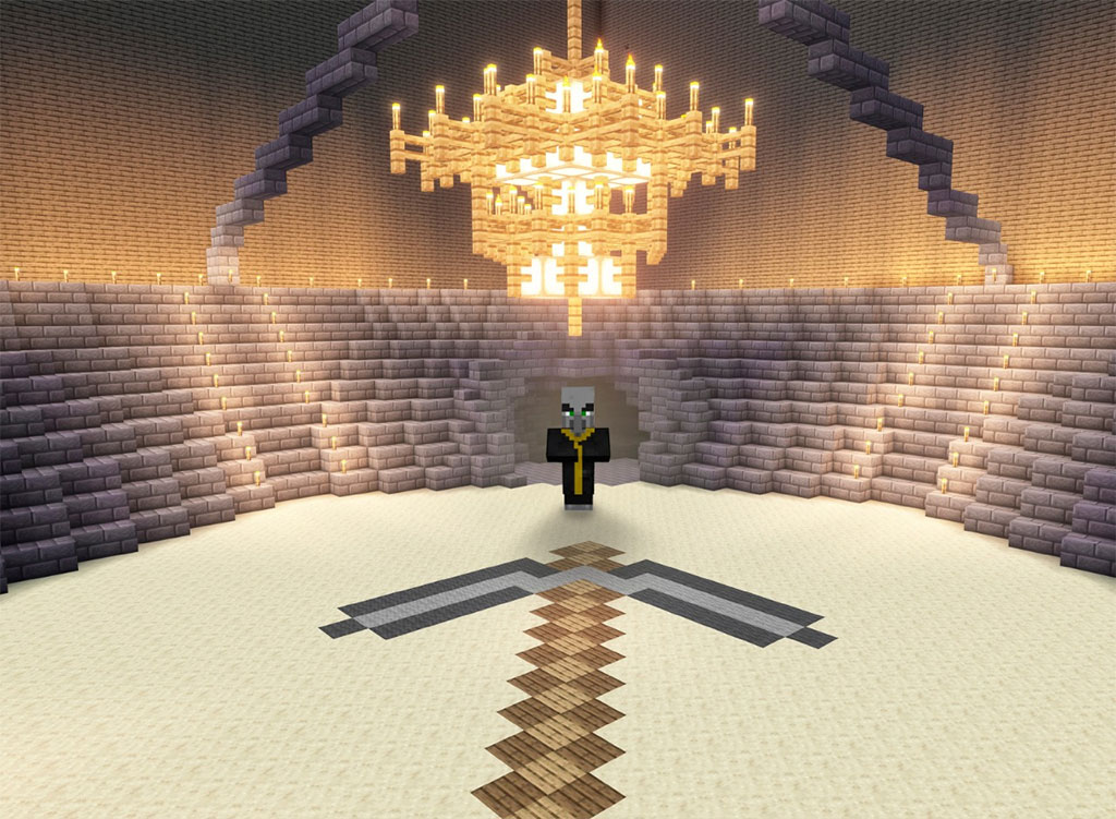 Дойдя приблизительно до середины коридора, ведьма остановилась и повернула налево в одну из арок. Мы оказались в овальном зале с огромной люстрой на потолке. По стенам каскадом спускались каменные выступы, что делало помещение похожим на древнегреческую арену. На полу красивым орнаментом была выложена огромная стрелка, как бы указывая неведомое направление.