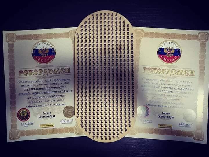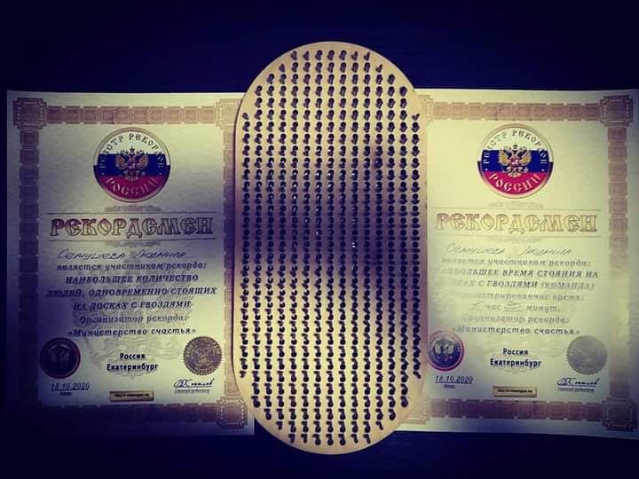 Позже, в том же 2020 году, мы приняли участие в массовом рекорде по гвоздестоянию в Екатеринбурге, где больше 200 человек простояли 1 час 30 минут.