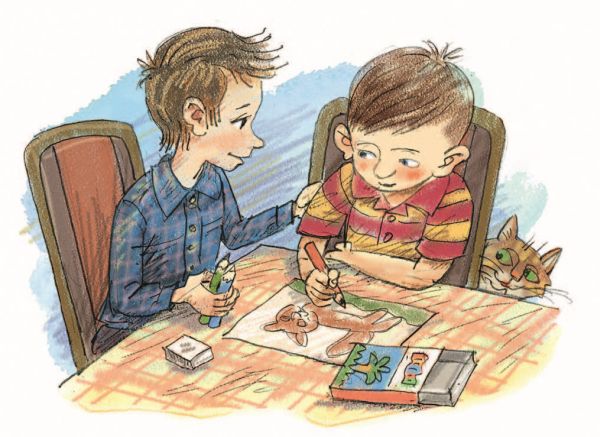 – Мне, – говорит Лена, – только листочки на деревьях нарисовать надо да травку зелёную.