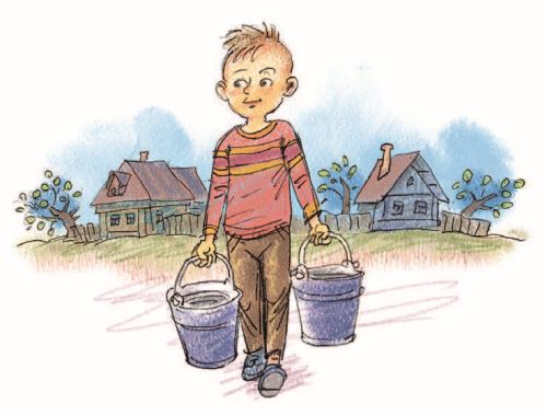 А третий к матери подбежал, взял у неё вёдра тяжёлые и потащил их.
