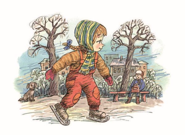 Витя подошёл к ним. Взявшись за руки, все трое весело заскользили по льду. А девочка сидела на скамейке, тёрла ушибленную коленку и плакала.