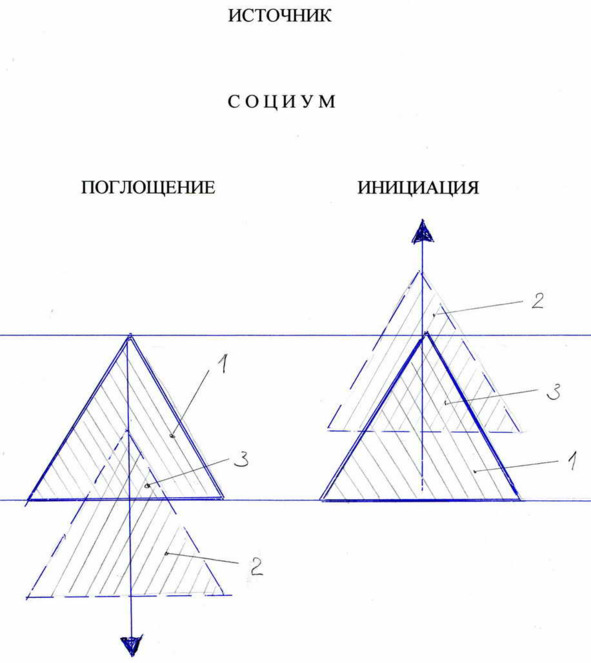 На рисунке 2 (справа) – картина мира в случае прогресса общества (движение пирамиды социума по шкале вверх). Энергии творческого созидания в зонах 2 и 3 являются основой благодатного инновационного климата. Зона 3 – зона жизни расширяется вследствие освоения новых видов энергии.