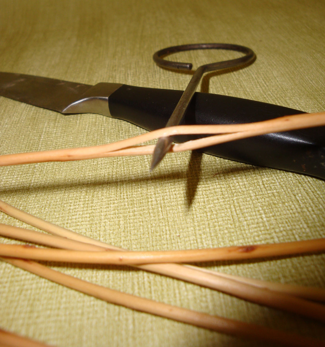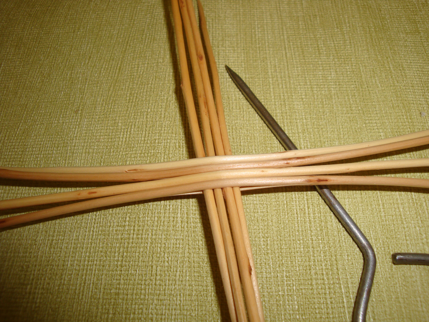 Оставшиеся 4 прута заострите с одного конца и аккуратно проденьте их в расщепы. Должна получиться прочная крестовина 4х4 – основа будущего донышка.
