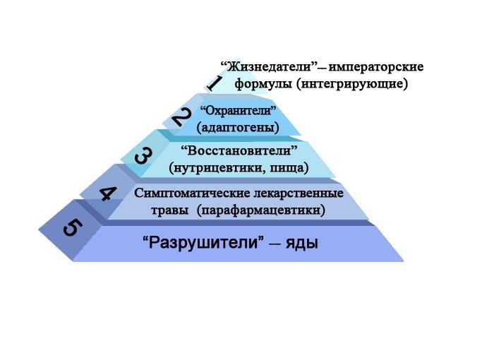 Для того чтобы понять, как можно лечить не отдельные органы, а организм в целом, почерпнем некоторые знания из сокровищницы восточной медицины. Там существует понятие о «Пирамиде лекарств», то есть о том, что лекарства составляют определённую иерархию и играют разную роль в тактике лечения.