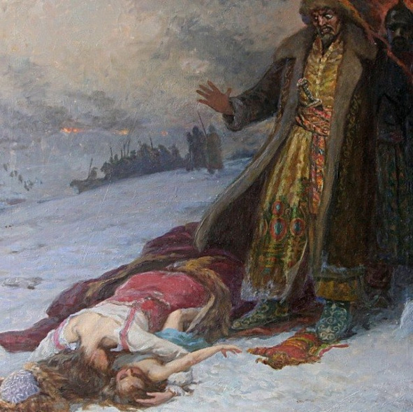 21 декабря 1237 года была взята Рязань. Осада с 16 декабря.1 Послы князяКак река, течёт орда, ведомая Батыем.Разоряют и сжигают города России.Тьма кочевников монголо-татарскихВстало близ земель Рязанских.Век 13 суровый. Дани требуют монголы:Часть 10-ая во всём: в князьях, людях, в остальном.Сына Фёдора послал с дарами князь Рязанский.Принял его царь Батый с воинством татарским.Дань, подарки и вино. Хану это нравится.«Мне отдай свою жену. Говорят красавица».Не отдал любящий муж желанного трофея,Хана взгляды узких глаз холодом повеяли.В поле выведен, убит сын князя рязанского,А молва стрелой летит, что Батый на Русь валит.Юрий- князь к братьям спешит и о помощи молит.От князей помочь – отказ. Нет единства братского.2 Евпраксия«Но надо ли решать за сыновей?» —возможно, думала она у парапета.И дует ей в лицо декабрьский ветер,Холодные порывы всё сильней.Несут они беду и запах смерти, пота.За городом кровь льётся рекой.Никто остановить её не волен.Наверное, их рок такой.А на руках наследник князя, сын.Как радовались все его рождению!И снова её гложет червь сомнения.Послы все перебиты, спасся лишь один.Он пестовал, растил князя младенцем,ему пришлось его в степи и хоронить.Она заранее узнала своим сердцем,что вместе теперь на небе им быть.Звон колокольный не стихает.Шесть лет назад был свадьбы перезвон.В любви счастливой с мужем были рядом.Героем мужественным оказался он.Что сына ждёт, потомка князя,полон врага, огонь иль смерть?Вскипают слёзы. Будем рядом.Должны мы вместе умереть.Звон колокольный всем несёт беду.Шорох на лестнице…Нет, с парапета вниз…и сына не отдам врагу.