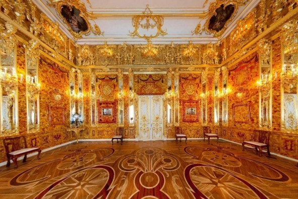 Царское Село. Екатерининский дворец. Самый знаменитый интерьер – Янтарная комната, спроектированная Ф.Б.Растрелли. Это часть большой анфилады, протянувшейся по всему фасаду дворца