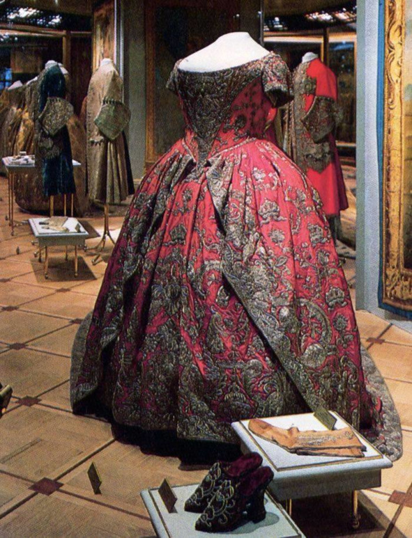 Туфли и платье (малиновая парча, расшито серебром, талия – 97 см., изготовлено в Берлине) императрицы Екатерины I к коронации 7 мая 1724 года. Петр Великий возложил корону на голову своей второй супруги в Успенском соборе московского Кремля
