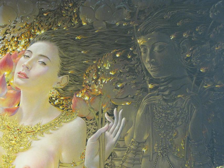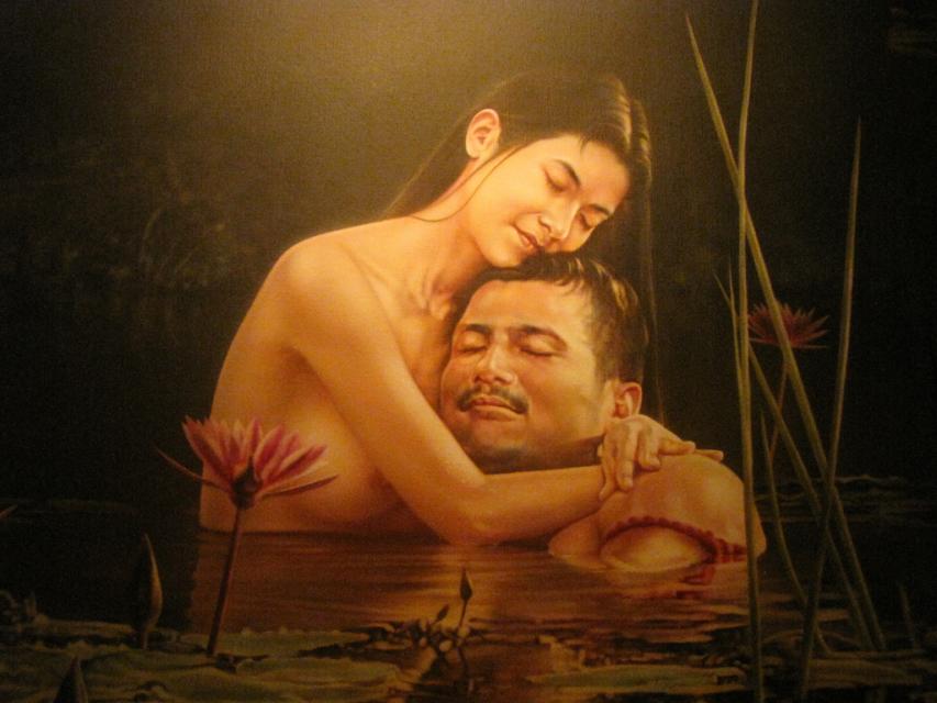 Почти все картины: и большие, и маленькие, похоже, воплощение мифов и легенд Востока. Она любила рисовать для себя, поэтому с первой же картины отметила тонкость мастерства художников. Но две из них просто впечатались в память. На одной – среди растений, в воде по пояс стоят мужчина и женщина. Они не отличаются особой красотой. Обычные лица, но в их объятии столько нежности и любви!